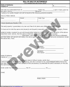 This Bill of Sale of Automobile includes the car’s make and model, VIN, and key details. The seller confirms full ownership with no claims. It also includes the required Odometer Disclosure Statement, to be signed before a notary.